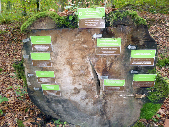Auf einer weiteren Tafel gegenüber der Baumscheibe konnten wir Näheres zur Namensnennung erfahren. Die Germanen waren überzeugt, die Eiche wäre Wohnung der Götter (Näheres in meinem früheren Blog). Wodan (neue Schreibweise „Wotan“) steht für einen germanischen Gott.