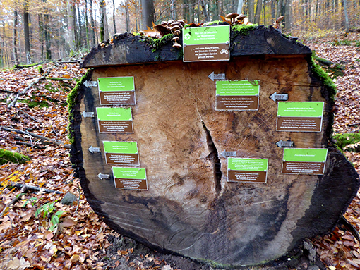 Der andere untere Stammteil lag am Boden und der ForstBW (Forst Baden-Württemberg) hatte Schilder an einigen Jahresringen angebracht. Am obersten Schild war dies zu lesen: „Was sich zu Lebzeiten der Wodanseiche in der Welt ereignete und wozu Holz, Früchte und Rinde der Eiche in den jeweiligen Epochen genutzt wurden.“