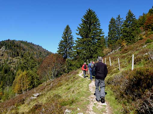 Wir gingen bei herrlichem Sonnenschein und einem kräftigen Wind zunächst an alten Schwarzwald-Höfen vorbei und wanderten auf halber Talhöhe den Geissenpfad entlang. An einigen Stellen ist der schmale Weg steinig. Hier ist Trittsicherheit gefragt. An einer Stelle ragte ein glatter, flacher Fels in den Weg hinein. Hier strauchelte ich, konnte mich jedoch abfangen. Wegen der Geissen ist der Weg beidseitig mit Elektrozäunen versehen. Leider sahen wir keine einzige Geiss (Ziege). Sie waren wohl schon in den Ställen.