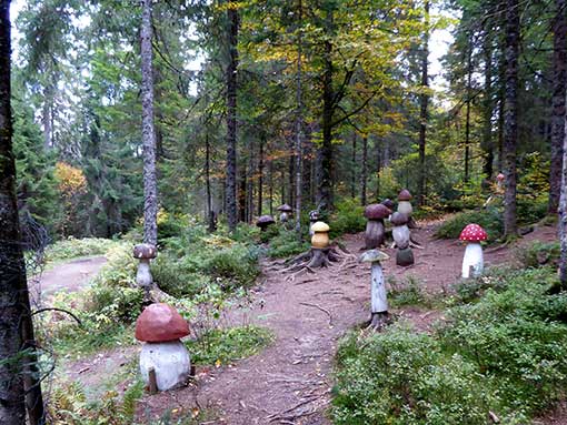 An einer Stelle kamen wir Riesenpilzen, die der Natur nachgebildet waren, vorbei. Es war eine super Idee, solche Pilze an einem schönen Waldareal aufzustellen.