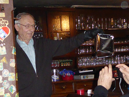 Trotz Schneetreiben fanden sich doch etliche Zuhörer in der Wirtshausstube ein. Hier wurde den Teilnehmern kräftig eingeheizt. Der mit Holz befeuerte alte Ofen mit langem Ofenrohr strahlte eine angenehme Wärme aus. Gegenüber der Theke nahmen die Gäste Platz.