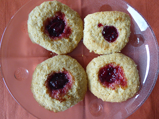 Hand durchkneten. Auch hier werden Kugeln geformt und auf ein mit Backpapier ausgelegtes Blech gesetzt. Mit einem Teelöffel werden die Kugeln eingedellt und mit Marmelade oder einer halben Belegkirsche ausgefüllt. Ich verwendete Himbeermarmelade und einen Fruchtaufstrich Sauerkirsch-Granatapfel. In diesem Aufstrich waren Kirschenstücke vorhanden.