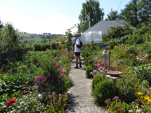 Bevor themenbezogene Führungen (Hildegard von Bingen, Kräuterapotheke, Homöopathie im Garten) stattfanden, hatte ich die Gelegenheit, den Garten näher zu inspizieren. Links vom Garten ist ein altes mit Flechten besetztes Vogelhäuschen zu sehen. Dann ging es in den Garten. Die Besucher konnten sich überzeugen, wie prächtig die Pflanzen in dieser Höhe (über 900 m ü. M.) gedeihen. Nur über den Winter muss die Expertin einige Pflanzen ins Haus holen. Auch Tomaten und Gurken gedeihen im Freien nicht so gut, dafür in ihrem Gewächshaus.