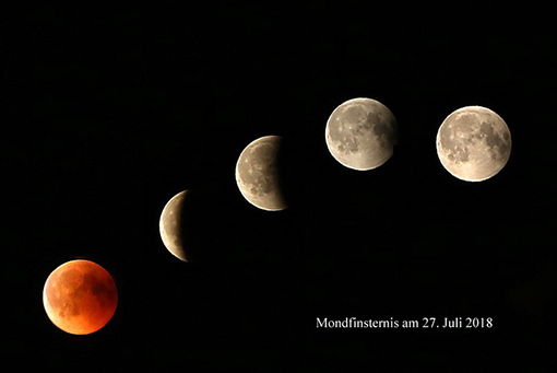 Am Freitag, den 27.07.2018 war die längste Mondfinsternis des 21. Jahrhunderts zu sehen. Sie dauerte 1 Stunde und 43 Minuten. Wer es noch länger haben will, der kann am 09.06.2123 schauen und sich auf 3 Minuten länger erfreuen. Ich staune immer wieder, wie genau die Astronomen die Himmelsereignisse genau berechnen können.