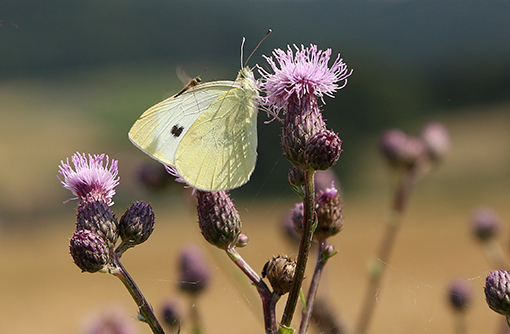 Die Ackerdistel zählt zur Familie der Korbblütler. Man findet sie an Weg- und Feldrändern. Während der Blütezeit im Spätsommer kann man die Distel gut an den hell-violetten Blütenkörbchen erkennen.