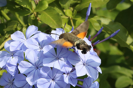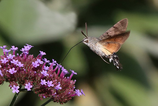 Nun Sie haben es bestimmt erraten, um welches Insekt es sich handelt. Es ist das Taubenschwänzchen (Macroglossum stellatarum). Obwohl es zu den Nachtfaltern gehört, ist es auch tagsüber unterwegs. Die Falter gehören zu den wenigen Insekten, die auch rückwärts fliegen können. Aber noch etwas ist wichtig: Sie können sogar Pflanzenbewegungen durch den Wind dank ihrer Augen perfekt durch den Flug kompensieren. Somit ist gewährleistet, dass der Falter mit seinem Rüssel in die Blüten gelangt und genügend Nektar bekommt. Die Schlagfrequenz der Flügel beträgt 70 bis 90 Schläge in der Sekunde.