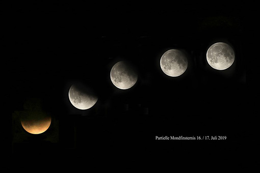 Am 16. Juli 2019 war am Himmel eine partielle Mondfinsternis zu sehen. Die exzellente Hobbyfotografin Elisabeth Faber liess es sich nicht nehmen, in Freiburg einige Phasen der partiellen Mondfinsternis zu fotografieren, als der Mond hinter dem Schlossberg hervortrat. Schon am 27. Juli 2018 fotografierte sie eine totale Mondfinsternis in mehreren Phasen (Blog vom 31.07.2018: „Längste Mondfinsternis: Die grosse Mond-Show“). Sie begeisterte schon damals mit ihren einmalig schönen Fotos vom „Blutmond“.
