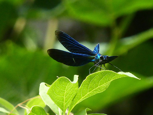 Dann sah ich etwas Blaues herumflattern. Ich verfolgte das Insekt mit Argusaugen. Es hielt sich nicht lange auf einem Ästchen auf. Es handelte sich hier um eine Blauflügel-Prachtlibelle. Mit etwas Geduld konnte ich zum ersten Mal diese mit meiner Lumix-Kamera per Tele aufnehmen. Und schon wieder hatte ich ein Männchen im Visier. Bei Männchen ist der ganze Flügel dunkel gefärbt und besitzt kein Flügelmal. Bei den Weibchen sind die Flügel bräunlich getönt, das Flügelmal ist weiss. Bei der Balz präsentiert das Männchen die leuchtend rote Unterseite seines Hinterleibs.