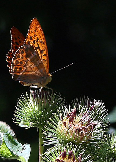 Zunächst erblickte ich ein Zitronenfalter, der flink herumsauste. Hier war Geduld angesagt. Als dieser Nektar saugte, konnte ich ihn ablichten. Auch ein Kohlweissling und ein Kleiner Heufalter flatterten herum. Dann kam der erste Höhepunkt. Als ein Kaisermantel mir vor die Linse flatterte, drückte ich den Auslöser. Dann verfolgte ich ihn auf einer kurzen Wegstrecke und es gelangen mir mehrere Aufnahmen mittels Tele. Die Flügeloberseite war leuchtend orangebraun mit schwarzbraunen Streifen- und Punktfleckmuster. Es war ein männliches Exemplar. Das konnte ich erst zu Hause in einem Insektenbuch nachlesen. Männchen haben nämlich Duftschuppenstreifen auf der Oberseite. Mein Gedanke war, wo war das Weibchen? Weit und breit war keines zu sehen. Weibchen können auch in einer grünlich grauen Farbform auftreten. Beide Geschlechter haben auf der grünlichen Unterseite der Hinterflügel silbrige Schrägstreifen. Deshalb wird der Kaisermantel auch Silberstrich genannt.