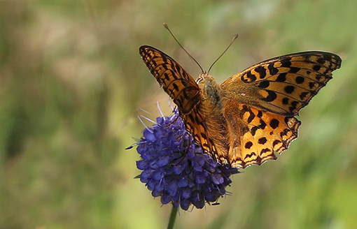 Der schöne, rund 6 cm grosse Falter, erinnert an einen kaiserlichen Brokatmantel in orangem (Männchen) bzw. gelblichen (Weibchen) Farbton. Während einer BUND-Exkursion (s. Blog vom 02.08.2019: „BUND-Exkursion: Auf den Spuren der Schmetterlinge“) entdeckte und fotografierte ich einen Kaisermantel mittels Teleobjektiv. Die Flügeloberseite war leuchtend orangebraun mit schwarzbraunen Duftschuppenstreifen- und Punktfleckmuster. Es war ein männliches Exemplar. Die Falter finden wir auf den Blüten von Disteln, Wasserdost, Greiskraut, Zwerg-Holunder und Liguster.