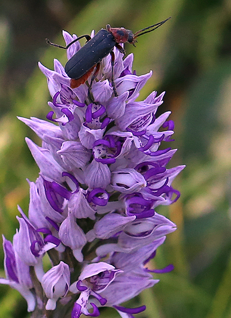 Das Helmknabenkraut ist eine Augenweide. Die Blüten sind purpurn bis rosarot und fein rot punktiert. Durch das Zusammenneigen der 3 oberen Blütenblätter entsteht eine Helmform. Elisabeth Faber gelang wieder eine schöne Aufnahme mit einer Besonderheit. Auf dem Helmknabenkraut krabbelte ein Soldatenkäfer. Es ist ein Weichkäfer, der sich von Pollen und von anderen Insekten ernährt.