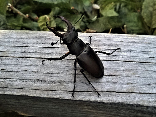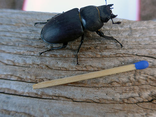 In den letzten Jahren bekam ich trotz intensiver Suche keinen Hirschkäfer vor die Kameralinse. Dann kam endlich eine gute Nachricht. Christian Wirth, ehemaliger Gymnasiallehrer in Schönau und Schopfheim, ist ein Käfer- und Schmetterlingsfreund und kann mit vielen Erlebnissen mit dem Hirschkäfer aufwarten. Kürzlich rief er mich an einem Abend kurz nach 21 Uhr an. Ich solle doch in seinen Garten kommen, um Hirschkäfer im Flug zu beobachten. Nach Erreichen seines Gartens sah ich schon die ersten Käfer um einen Haselstrauch herumfliegen. Ein Käfer schwirrte mit Gebrumm auf mich zu. Ich hätte ihn mit der Hand fangen können. Aber er wich geschickt aus. Ein Käfer sauste an eine Hecke, fiel auf die Straße und blieb auf dem Rücken liegen. Herr Wirth hob ihn auf und setzte ihn auf ein Holzbrett. Der männliche Käfer war völlig bewegungslos, das Geweih war nach oben gerichtet. „Das ist eine Schockstarre“, sagte Christian Wirth. Nach kurzer Zeit flog der Käfer davon.
