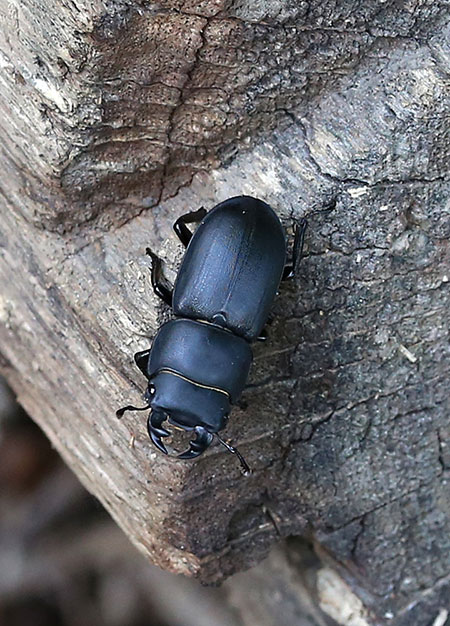 Es gibt auch einen Zwerghirschkäfer mit der Bezeichnung Balkenschröter. Einen solchen hat unser Käferfreund und auch die Hobbyfotografin Elisabeth Faber von Freiburg entdeckt und fotografiert. Er ist mattschwarz mit vergrösserten Kiefern. Die Männchen haben einen auffallend breiten Kopf. Die Weibchen sind mit einem schmäleren Kopf und weniger großen Kiefern ausgestattet. Die Larven entwickeln sich meist in abgestorbenem Buchenholz.
