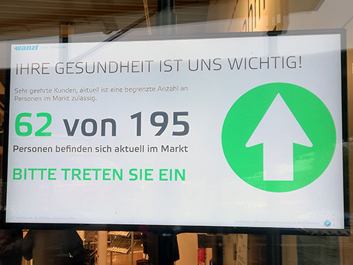 - Reduzieren von Kontakten (in Lebensmittelmärkten: Kaufen Sie möglichst allein ein und bleiben Sie bitte nur so lange im Markt wie nötig. Unser Lebensmittelmarkt Hieber in Schopfheim hat neben der Eingangstür einen Bildschirm aufgestellt mit Angaben zur Personenzahl, die sich gerade im Geschäft befinden, s. Foto).