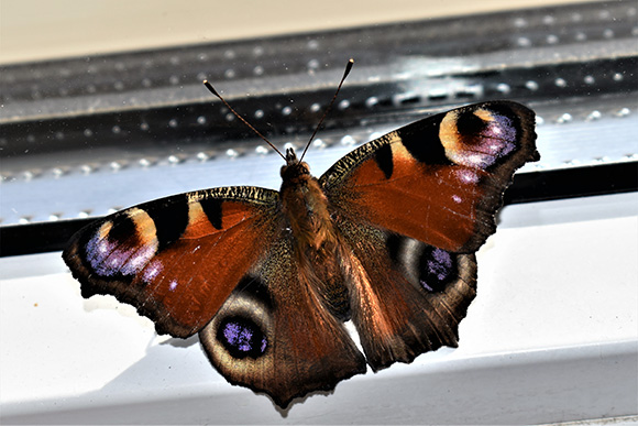Vor einigen Wochen flog ein Tagpfauenauge durch ein geöffnetes Fenster unserer Wohnung. Er setzte sich auf eine Fensterbank und zeigte seine geöffneten Flügel. Beeindruckend waren die rostroten Flügel mit Augenflecken. Es war ein prächtiger Anblick. Nach dem Fotografieren wurde er in die Freiheit entlassen.