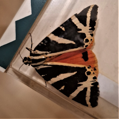 Der verirrte Falter flog zunächst ganz aufgeregt in der Wohnung herum, setzte sich auf eine LED-Lampe und dann auf einen Blumenstrauss. Mittels einer Fangbox, die Bruno Jaddatz entwickelt hat, konnte ich den Falter einfangen und ihn ins Freie entlassen. Der Russische Bär wird auch Spanische Flagge genannt. Der Name „Russischer Bär“ wurde geboren als man die pelzig behaarten Raupen erblickte. Der Name Spanische Flagge bezieht sich auf die Flügelfarbe.