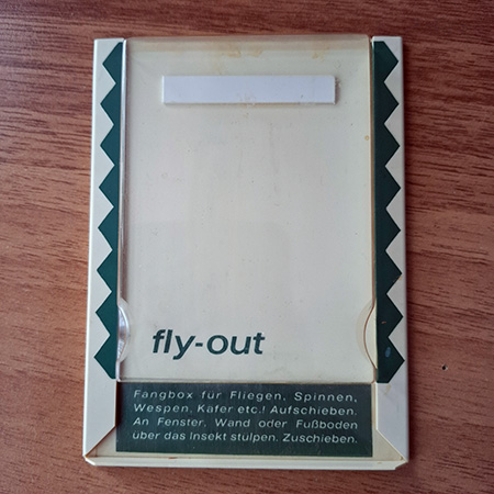 Bruno Jaddatz (1914-2002), der zuletzt in Lehnacker (Landkreis Lörrach) wohnte, war u.a. Maler, Designer, Grafiker, Filmplakatmaler und Erfinder (s. Bericht im Anhang). Er konstruierte eine Fangbox, mit deren Hilfe auf sehr elegante Weise Spinnen, Fliegen, Wespen, Käfer etc. aus der Wohnung entfernt werden können. Die geöffnete Box wird über das kriechende Insekt gestülpt und mit einer Klappe verschlossen. Im Freien wird die Box geöffnet und das Insekt in Freiheit entlassen. Leider wurde diese Erfindung aus Kostengründen nur in kleiner Stückzahl für den Eigenbedarf produziert.
