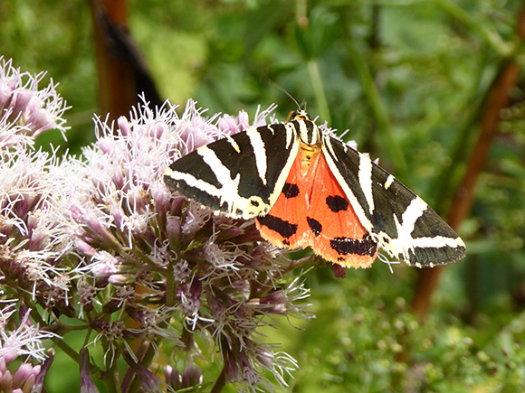 Keine Angst, es ist kein Bär, sondern ein Schmetterling, der zu den Bärenspinnern gehört. Er zeichnet sich durch weisslich gestreifte, schwarze Vorderflügel und leuchtend rote Hinterflügel mit 3-4 schwarzen Flecken aus. Bei uns schwirren auch Braune und Schwarze Bären herum, die jedoch ein ganz anderes Muster aufweisen.