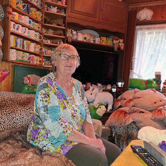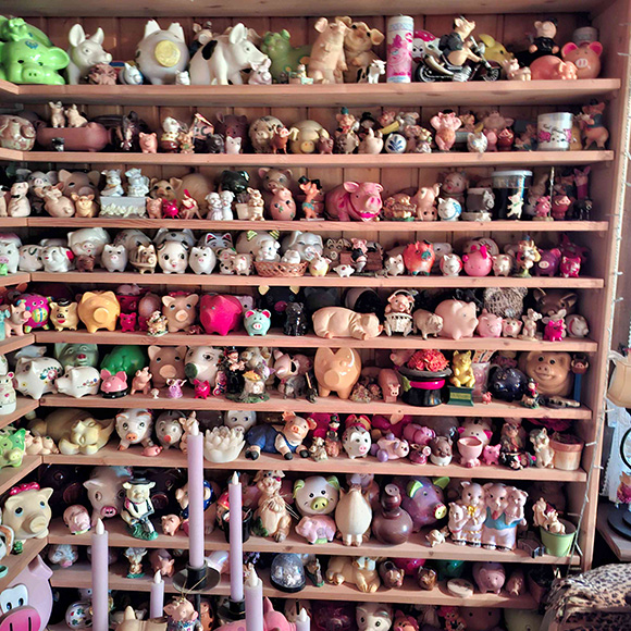 Die Schweinchen findet man auf Bilder, Gläser, Kaffeetassen, Kuscheltiere, Lampen, Bierkrüge. Sogar am Haupteingang ist eine Glocke und ein Kleiderhaken mit einer Tierverzierung zu sehen. Besonders üppig ist das Wohnzimmer eingerichtet. In jeder Ecke des Wohnzimmers und auf einer Treppe sitzen, thronen Tiere mit und ohne Ringelschwänzchen. Die Vielseitigkeit der Farben und Formen des herzlichen Tieres sind überall präsent. Da kommt man aus dem Stauen nicht heraus. Damit noch nicht genug, auch auf der Terrasse, auf einer Grünfläche im Garten und auf dem Dach ihres Hauses sind Tiere in allen Variationen zu sehen. Sogar 2 Solarschweine hat sie erworben. Während eines Besuches des BZ-Autors verrät sie eine Besonderheit: Sogar auf ihrer Bettwäsche prangen viele Fotos von Schweinchen. Die Sammlerin hat ihre Objekte noch nicht gezählt. Sie schätzt diese auf mehr als 1000 Exemplare.