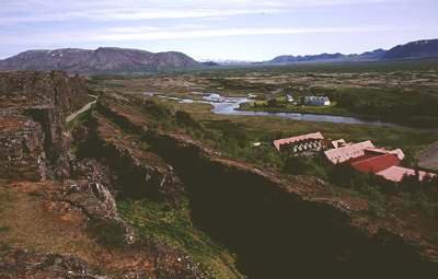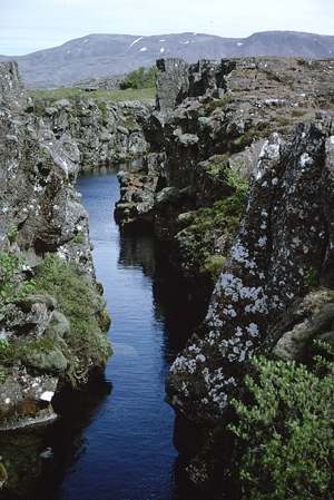 Auf Island sind auch Kräfte von kontinentalen Dimensionen zu erkennen, insbesondere in der Ebene von Thingvellir, ebenfalls ein geologisch junges Gebiet, das wegen des Auseinanderdriftens der Kontinentalplatten in 9000 Jahren um etwa 40 m abgesunken ist. Die beiden Platten bewegen sich mit einer Geschwindigkeit von 2 cm pro Jahr voneinander fort. Die Ebene ist von vielen Spalten (gja) durchzogen.
