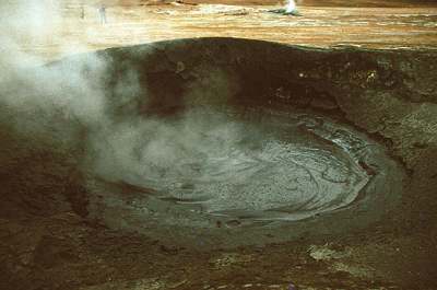 An den Anfang der Erdgeschichte zurückversetzt fühlte ich mich im Sommer 1992 in der so genannten "Teufelsküche" (Namafjall). Es handelt sich dabei um ein dampfendes Solfatarenfeld in der Nähe des Mückensees (Myvatn). In jenem Gebiet Islands gibt es kein pflanzliches oder tierisches Leben, sondern nur blubbernd siedenden, metallisch grauen Lehm, der in Erdlöchern brodelt und die Umgebung mit Schwefelausscheidungen kunstvoll färbt. Die Brühe wölbt sich zu farbigen Blasen, die hörbar platzen und nach fauligem Schwefelwasserstoff riechen.